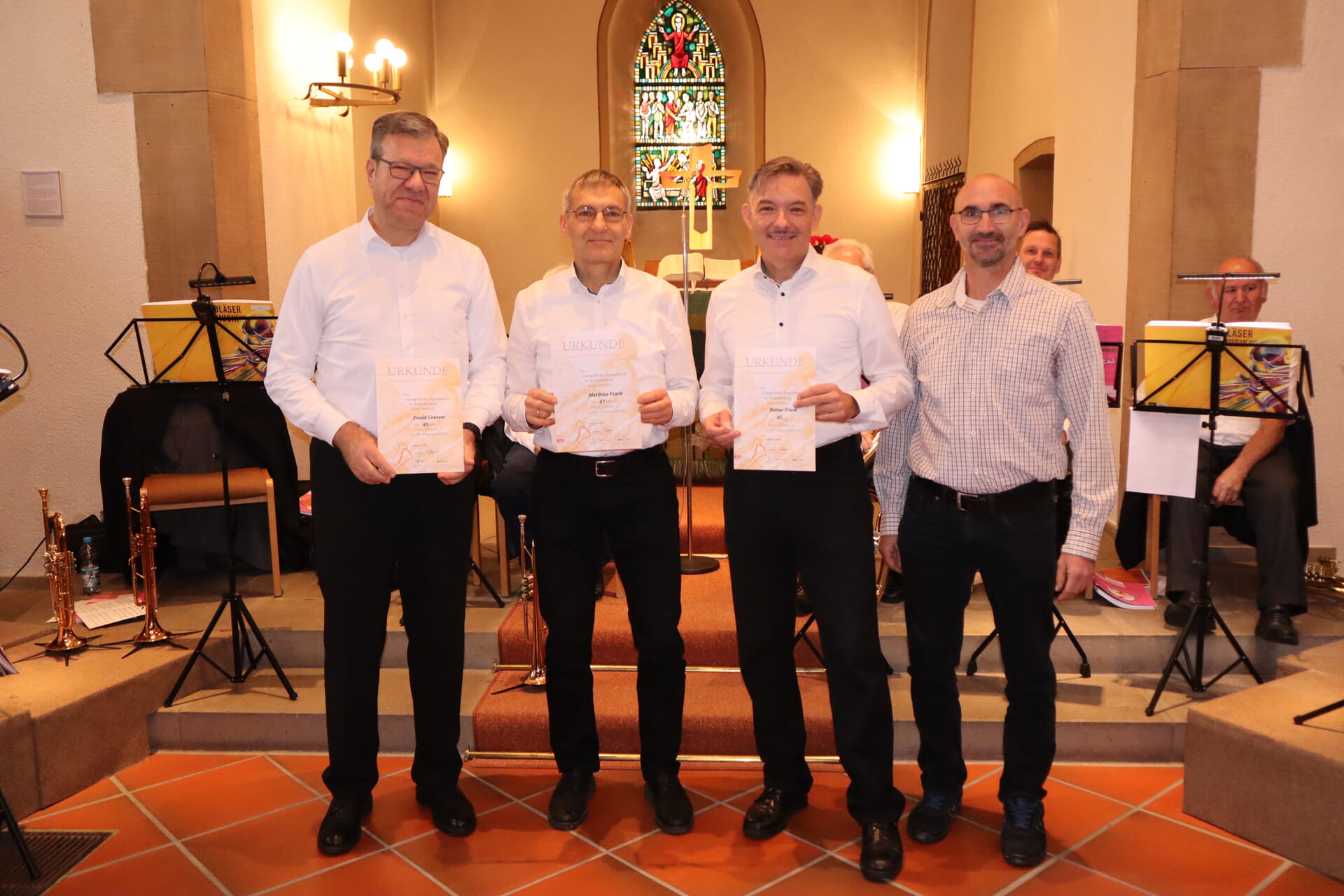 von links: E.Coerver 45 Jahre Posaunenchor, M. Frank 47 Jahre Posaunenchor, R. Frank 45 Jahre Posaunenchor, A. Baral Bezirksposaunenwart